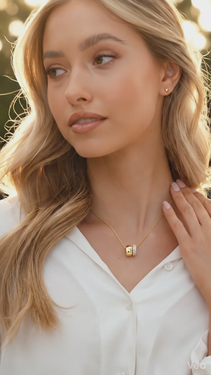 Wyjątkowy damski łańcuszek, który łączy w sobie romantyczną symbolikę, elegancję oraz uniwersalny styl. Centralnym elementem biżuterii są dwie niezależne, ruchome obrączki – jedna gładka, masywna w złotym kolorze oraz druga subtelniejsza, zdobiona lśniącymi cyrkoniami o diamentowym blasku.